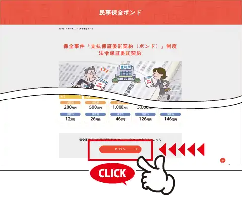 3 画面下部の「ログイン」をクリック!民事保全ボンド申込システムにて、お申し込みください。
